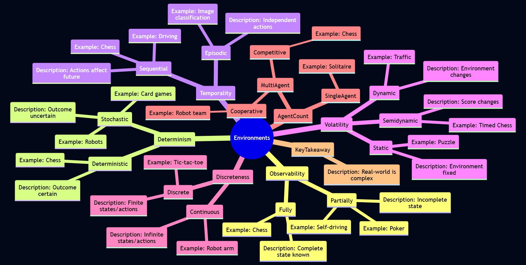 - Deterministic: If the next state of the environment is completely determined by the current state and the action executed by the agent, the environment is deterministic.