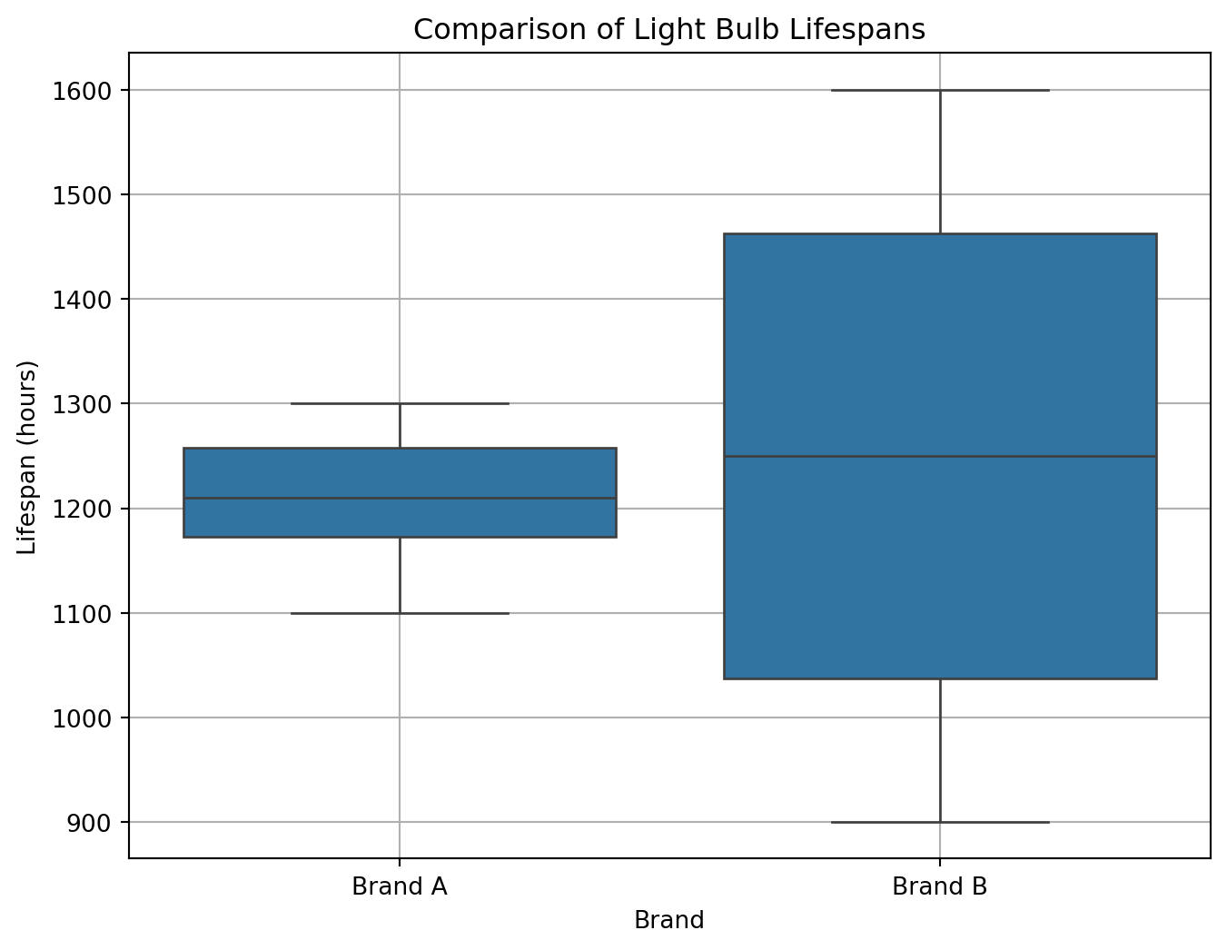 plt.show()Brand A Lifespan (hours): [1200 1250 1300 1100 1150 1220 1280 1180]