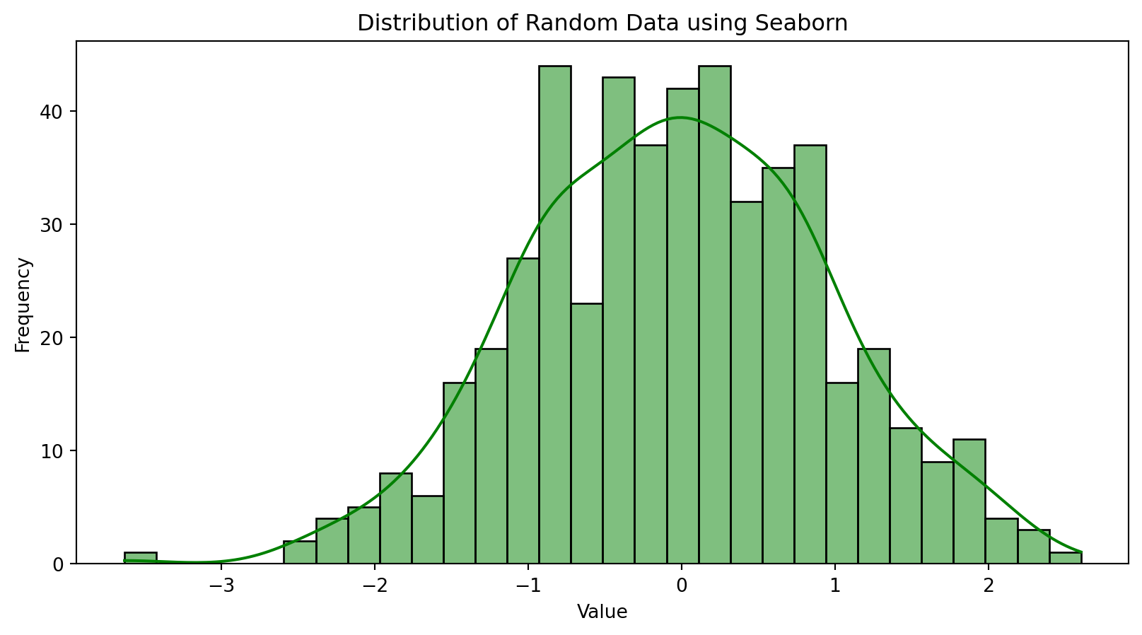 import matplotlib.pyplot as pltimport seaborn as snsimport numpy as np # Re-importing for clarity if this cell is run standalone# Let's generate some sample data for our plots x_values = np.linspace(-np.pi, np.pi, 200) # 200 points from -pi to pi y_sine_values = np.sin(x_values) y_cosine_values = np.cos(x_values) some_random_data = np.random.normal(loc=0, scale=1, size=500) # 500 numbers from a normal distribution# An example using Matplotlib to plot sine and cosine waves plt.figure(figsize=(10, 5)) # Set the figure size plt.plot(x_values, y_sine_values, label='Sine Wave', color='blue') plt.plot(x_values, y_cosine_values, label='Cosine Wave', color='red', linestyle='--') plt.title('Sine and Cosine Waves using Matplotlib') plt.xlabel('X (radians)') plt.ylabel('Y (value)') plt.legend() # Show the legend plt.grid(True) # Add a grid plt.show() # Display the plot# An example using Seaborn to plot a histogram (distribution plot) of random data plt.figure(figsize=(10, 5)) sns.histplot(some_random_data, bins=30, kde=True, color='green') # kde adds a density curve plt.title('Distribution of Random Data using Seaborn') plt.xlabel('Value') plt.ylabel('Frequency') plt.show()