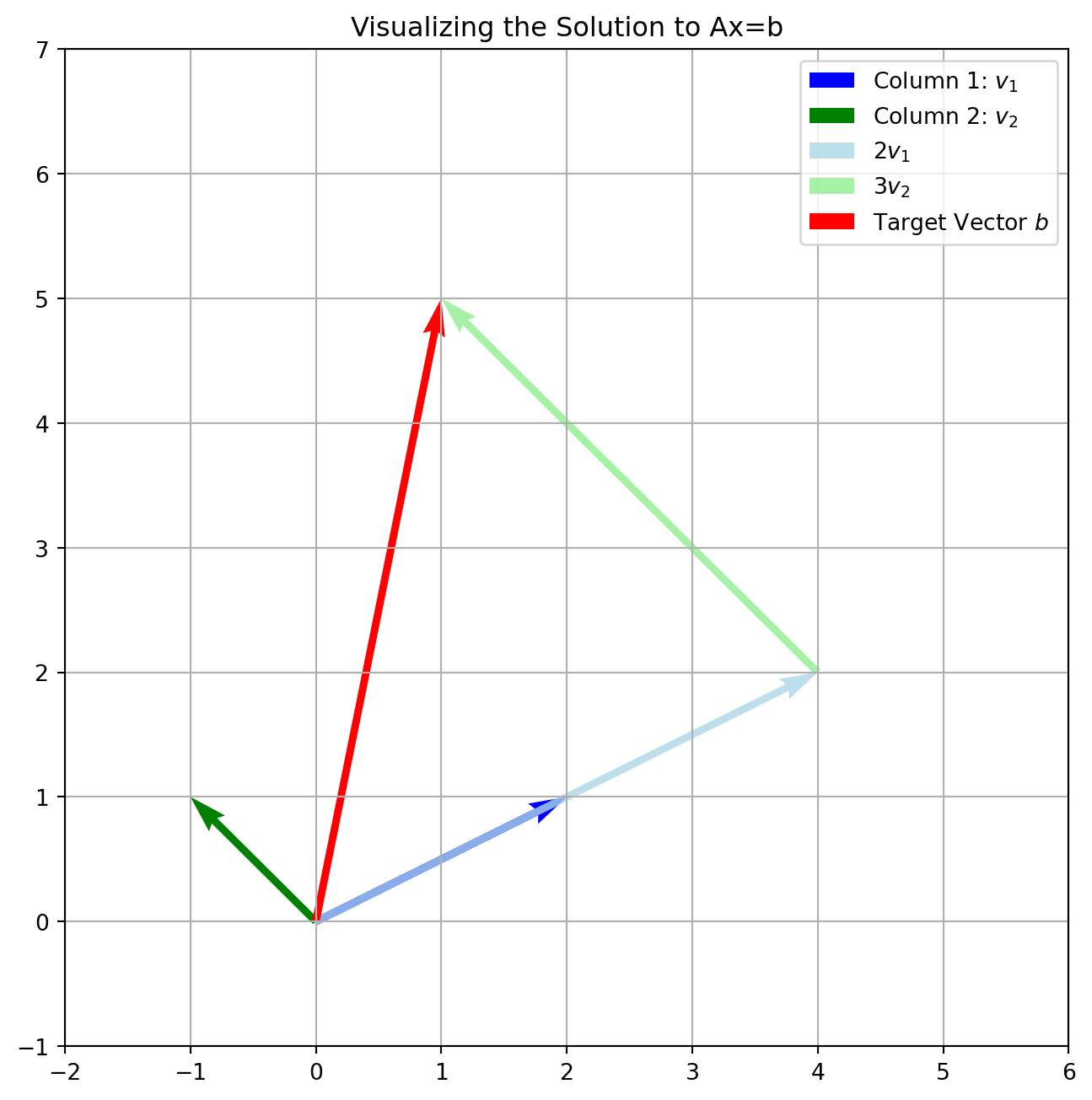 import numpy as npimport matplotlib.pyplot as plt# The column vectors from our systemv1 = np.array([2, 1]) # First columnv2 = np.array([-1, 1]) # Second column# The target vector on the right-hand sideb = np.array([1, 5]) # Should equal 2*v1 + 3*v2# The solution we will learn to find is x=2, y=3x, y =2, 3# --- Visualization ---plt.figure(figsize=(8, 8))ax = plt.gca()# Plot the basis vectorsax.quiver(0, 0, v1[0], v1[1], angles='xy', scale_units='xy', scale=1, color='blue', label=r'Column 1: $v_1$')ax.quiver(0, 0, v2[0], v2[1], angles='xy', scale_units='xy', scale=1, color='green', label=r'Column 2: $v_2$')# Plot the linear combination step by stepax.quiver(0, 0, (x*v1)[0], (x*v1)[1], angles='xy', scale_units='xy', scale=1, color='lightblue', alpha=0.8, label=r'$2v_1$')ax.quiver((x*v1)[0], (x*v1)[1], (y*v2)[0], (y*v2)[1], angles='xy', scale_units='xy', scale=1, color='lightgreen', alpha=0.8, label=r'$3v_2$')# Plot the target vector bax.quiver(0, 0, b[0], b[1], angles='xy', scale_units='xy', scale=1, color='red', label=r'Target Vector $b$')# Formattingax.set_xlim(-2, 6)ax.set_ylim(-1, 7)ax.grid(True)ax.set_title("Visualizing the Solution to Ax=b")ax.legend()plt.show()