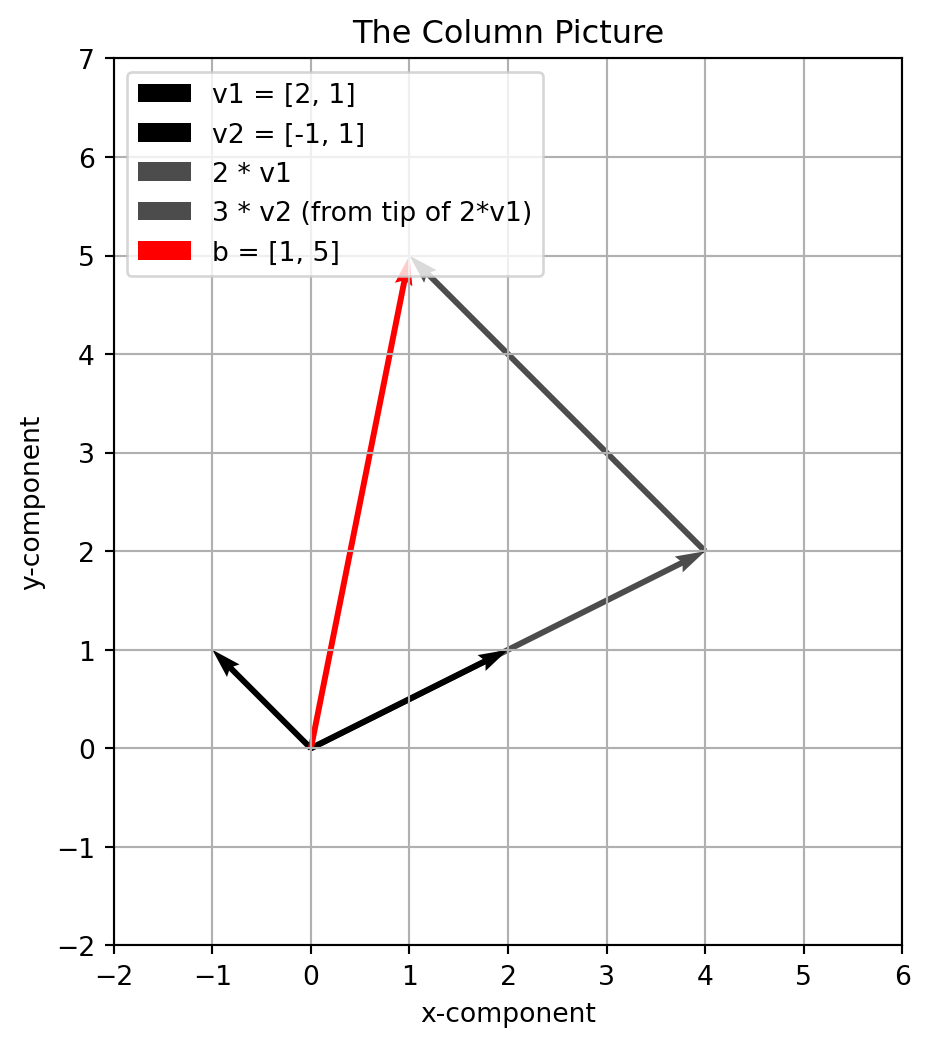 import numpy as npimport matplotlib.pyplot as plt# Define the vectorsv1 = np.array([2, 1])v2 = np.array([-1, 1])b = np.array([1, 5])# The solution coefficientsx, y =2, 3# Prepare the figureplt.figure(figsize=(6, 6))ax = plt.gca()# Draw base vectors from originax.quiver(0, 0, v1[0], v1[1], angles='xy', scale_units='xy', scale=1, label='v1 = [2, 1]')ax.quiver(0, 0, v2[0], v2[1], angles='xy', scale_units='xy', scale=1, label='v2 = [-1, 1]')# Draw scaled v1 (2 * v1) from originscaled_v1 = x * v1ax.quiver(0, 0, scaled_v1[0], scaled_v1[1], angles='xy', scale_units='xy', scale=1, alpha=0.7, label='2 * v1')# Draw scaled v2 (3 * v2) starting from the tip of 2*v1scaled_v2 = y * v2ax.quiver(scaled_v1[0], scaled_v1[1], scaled_v2[0], scaled_v2[1], angles='xy', scale_units='xy', scale=1, alpha=0.7, label='3 * v2 (from tip of 2*v1)')# Draw the target vector b from originax.quiver(0, 0, b[0], b[1], angles='xy', scale_units='xy', scale=1, color='red', label='b = [1, 5]')# Cosmetic adjustmentsax.set_xlim(-2, 6)ax.set_ylim(-2, 7)ax.set_xlabel("x-component")ax.set_ylabel("y-component")ax.set_aspect('equal', adjustable='box') # preserve vector directions/lengthsax.grid(True)ax.legend(loc='upper left')plt.title("The Column Picture")plt.show()